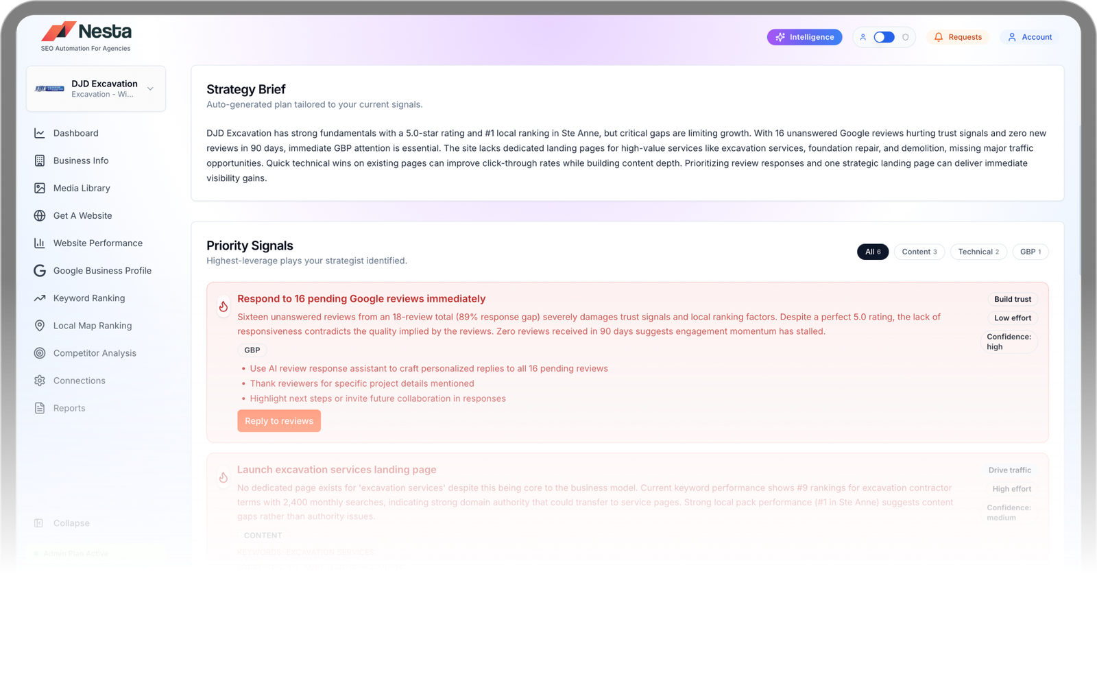 While other tools show fragments of data, Nesta works like a full-time SEO specialist—constantly analyzing your GBP, website, reviews, and competitors to find what’s holding you back. Then it drafts the fixes automatically, so you can ship improvements in minutes instead of weeks.